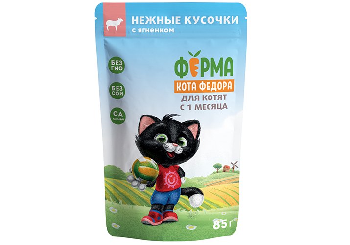 Ферма кота Фёдора Влажный корм Паучи для Котят с 1 месяца Нежные кусочки с Ягненком (цена за упаковку) 85г х 24шт