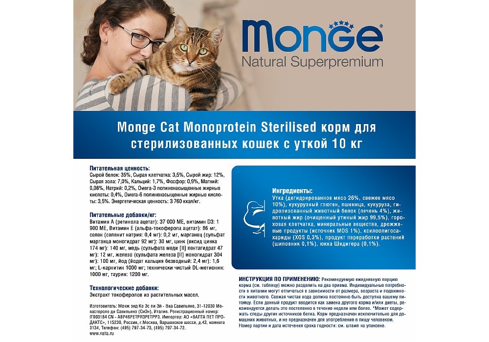Monge Cat Monoprotein Sterilised Сухой корм Монж Монопротеиновый для Стерилизованных кошек Утка 10 кг