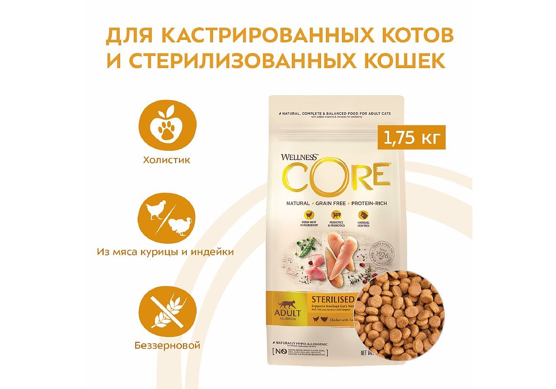Wellness CORE STERILISED разработан с учетом потребностей организма питомца, прошедшего кастрацию или стерилизацию, и помогает поддержать их здоровье и жизненный тонус.