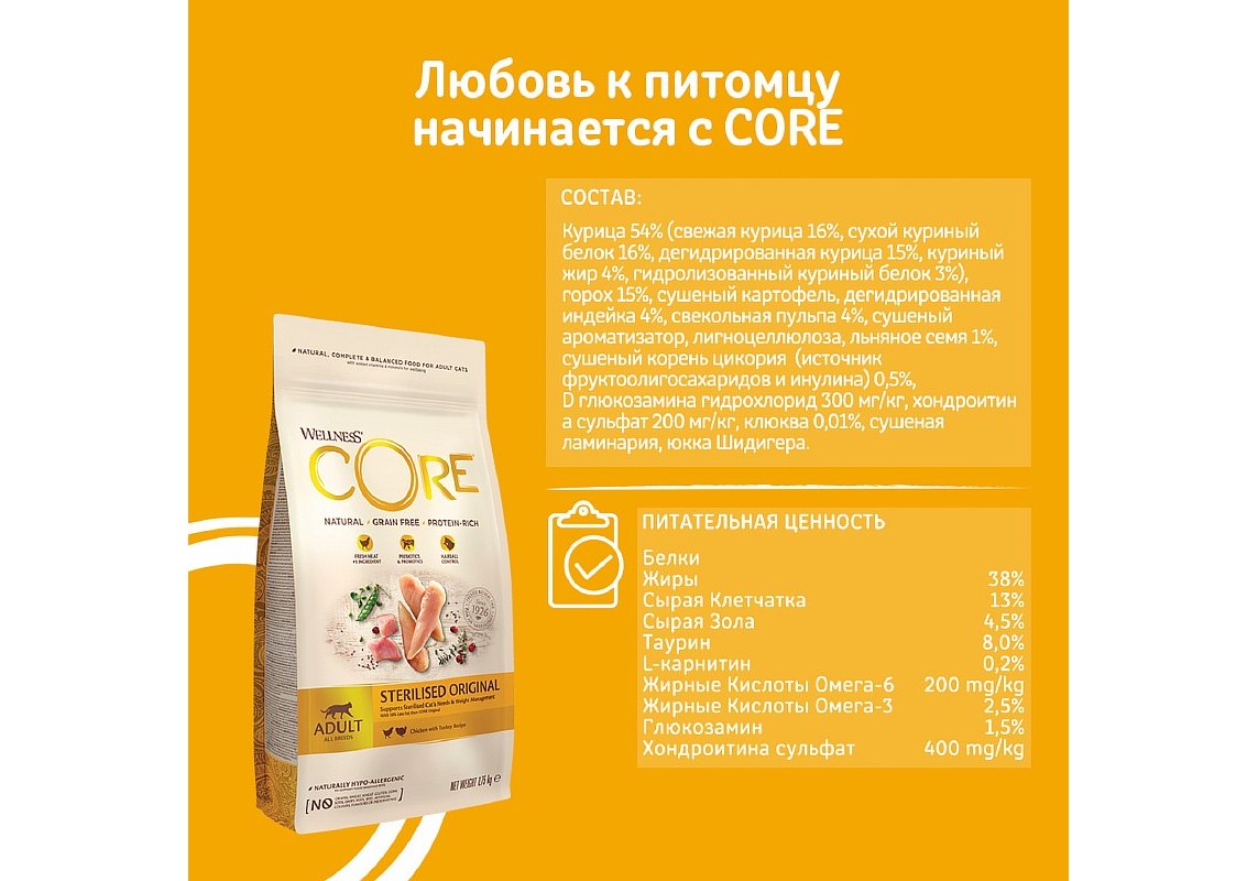 Натуральные корма для домашних животных Wellness Core — это качественное питание без искусственных ингредиентов или добавок, которые могут быть вредны для здоровья кошек и собак. Используя только свежие, настоящие и цельные пищевые ингредиенты, CORE обеспечивает необходимое питание в минимально обработанной форме.