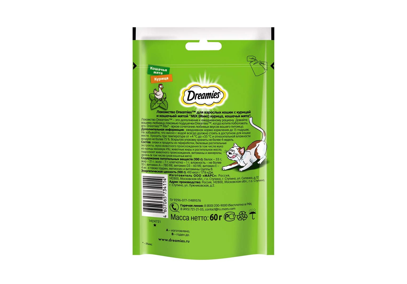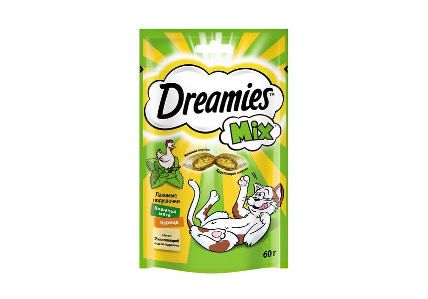Лакомство Dreamies™ Mix кошачья мята и курица - это яркое сочетание любимых вкусов вашего питомца!
