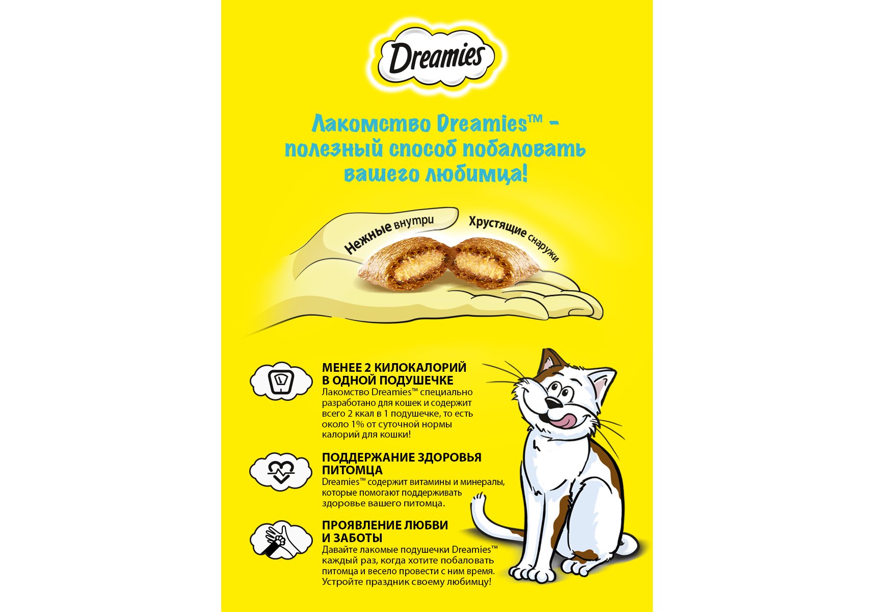 Dreamies ® Лакомые подушечки для кошек- это добавка к ежедневному рациону. Давайте Вашему любимцу Dreamies®, когда хотите побаловать его.