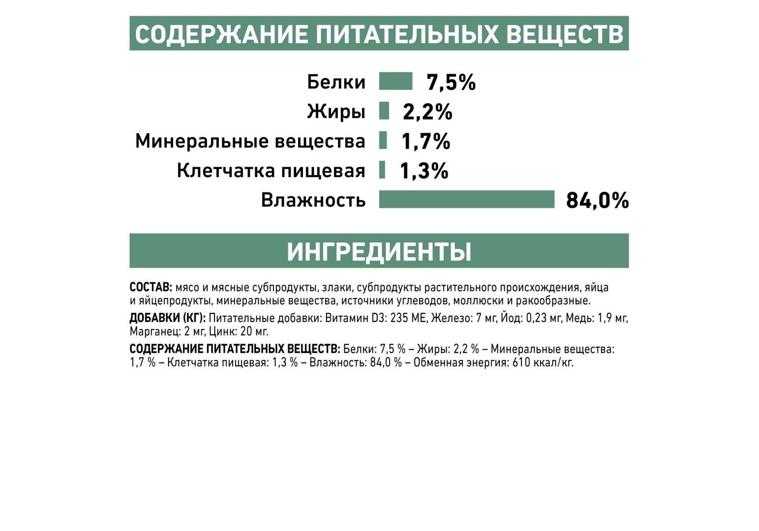 Витамин D3 235 ME, железо 7 мг, йод 0,23 мг, медь 1,9 мг, марганец 2 мг, цинк 20 мг. СОДЕРЖАНИЕ ПИТАТЕЛЬНЫХ ВЕЩЕСТВ Белки 7,5%, жиры 2,2%, минеральные вещества 1,7%, клетчатка пищевая 1,3%, влажность 84,0%. Обменная энергия: 610 (ккал/кг).Отзывы не найдены