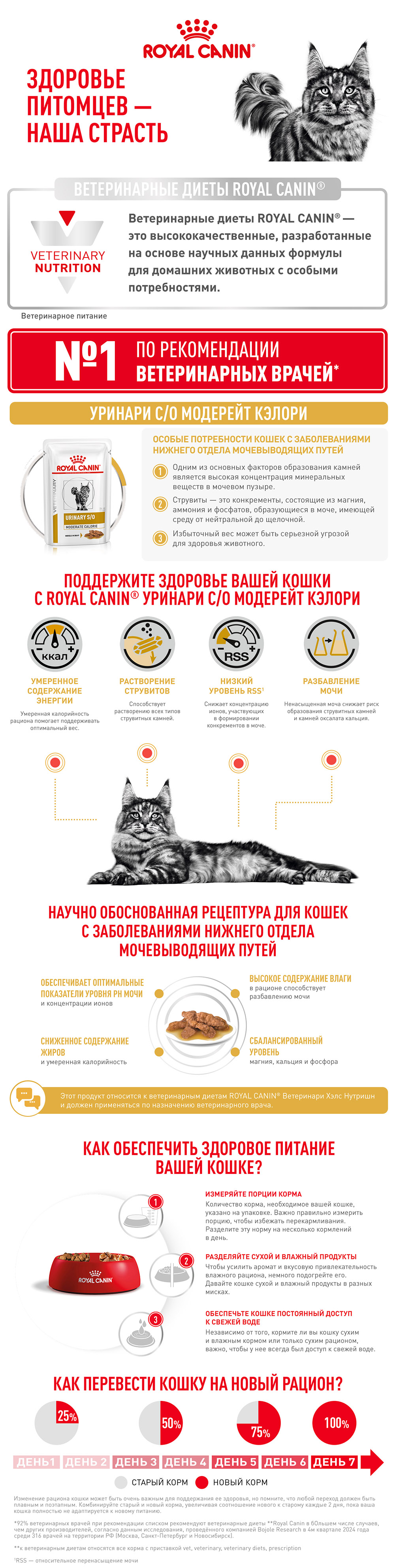 Royal Canin Urinary S\O Moderate Calorie Ветеринарный влажный корм (Консервы-Паучи) Роял Канин Уринари для кошек склонных к набору веса при Мочекаменной болезни (цена за упаковку) 85г х 28шт