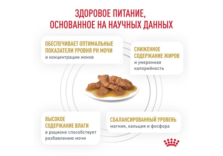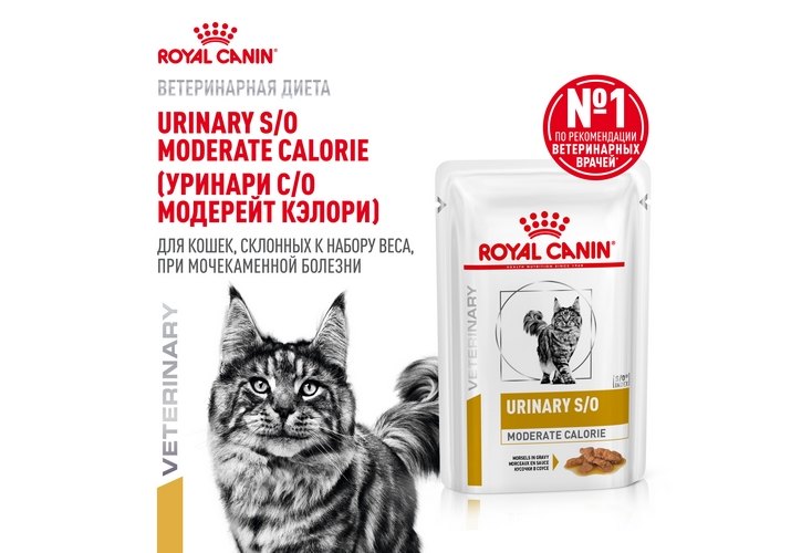 Влажный корм ROYAL CANIN® URINARY S/O MODERATE CALORIE (УРИНАРИ С/О МОДЕРЕЙТ КЭЛОРИ), мелкие кусочки в соусе - полнорационный диетический корм для взрослых кошек, склонных к набору лишнего веса, способствующий растворению струвитных камней и предотвращению их повторного образования за счет подкисления мочи и низкого содержания магния. Формула помогает поддерживать оптимальный вес кошки за счет умеренной калорийности.