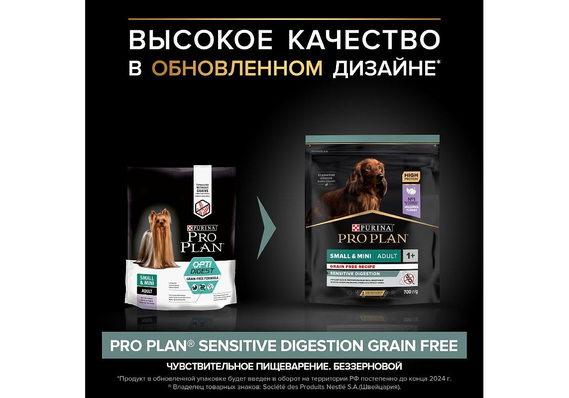 Корм сухой для взрослых собак мелких и карликовых пород PRO PLAN® Sensitive digestion.Grain free/ Для собак с чувствительным пищеварением беззерновой — это полюбившийся PRO PLAN® Opti Digest с новым названием, но с прежним составом и качеством.