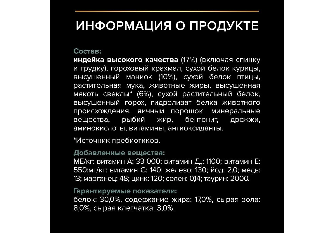 Индейка (17%), сухой белок курицы, гороховый крахмал, маниок (12%), белок гороха, животный жир, высушенный горох, высушенная мякоть свеклы, гидролизат белков животного происхождения, соевая мука, яичный порошок, минеральные вещества, рыбий жир, бентонит, дрожжи, аминокислоты, витамины, антиоксиданты(токоферолы природного происхождения). ДОБАВЛЕННЫЕ ВЕЩЕСТВА МЕ/кг: витамин А 33 000; витамин Д3 1100; витамин E 550; витамин C 140 мг/кг; железо 95 мг/кг; йод 2,4 мг/кг; медь 14 мг/кг; марганец 45 мг/кг; цинк 150 мг/кг; селен 0,14 мг/кг. ГАРАНТИРОВАННЫЕ ПОКАЗАТЕЛИ Белок 30.0%, содержание жира 17.0%, сырая зола 8.0%, сырая клетчатка 3.0%.PRO PLAN® от РURINA® — это 100% сбалансированное рационы высокого качества для поддержания здоровья Ваших питомцев на всех этапах их жизни.