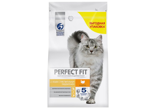 PERFECT FIT™ Sensitive – рацион, адаптированный специально для кошек с особенностями пищеварения. Он содержит пребиотики, способствующие поддержанию здоровой микрофлоры кишечника, и не содержит пшеницы и сои, которые могут вызвать дискомфорт в желудке кошки.
