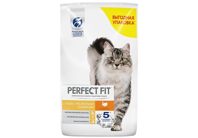PERFECT FIT™ Sensitive – рацион, адаптированный специально для кошек с особенностями пищеварения. Он содержит пребиотики, способствующие поддержанию здоровой микрофлоры кишечника, и не содержит пшеницы и сои, которые могут вызвать дискомфорт в желудке кошки.