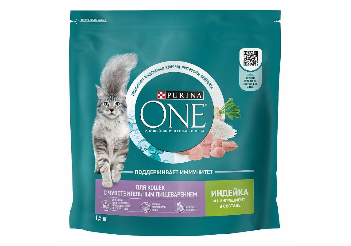 Корм Purina ONE® с индейкой для кошек с чувствительным пищеварением 1,5 кг — это: