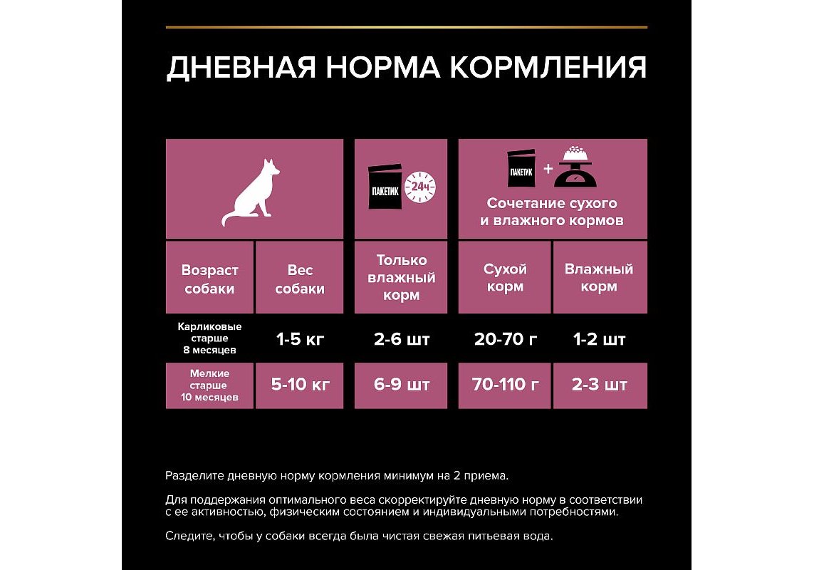 Рекомендации по кормлению: рекомендованная норма кормления указана в таблице. Разделите дневную норму кормления, указанную в таблице, минимум на два приема.Для поддержания правильного веса скорректируйте дневную норму в соответствии с ее активностью, физическим состоянием и индивидуальными потребностями. Для контроля здоровья вашей собаки обращайтесь в ветеринарную клинику на регулярной основе. Следите, чтобы у собаки всегда была чистая, свежая питьевая вода.