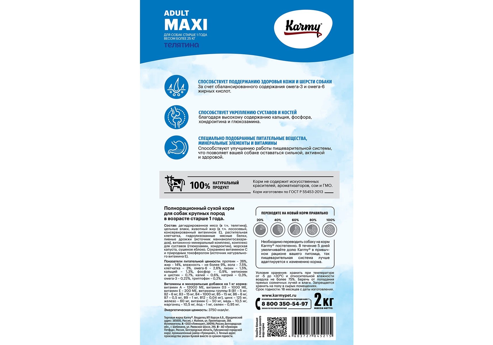 Karmy Maxi Adult Сухой корм Карми для взрослых собак Крупных пород Телятина 2 кг