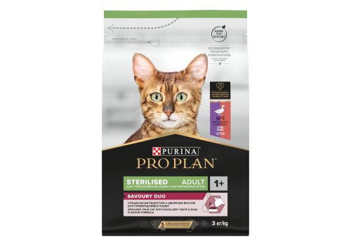 Команда квалифицированных ветеринарных специалистов и диетологов разработала сухой корм для стерилизованных привередливых кошек PRO PLAN® Sterilised SAVOURY DUO с двойным вкусом. Это сбалансированный корм, в котором есть весь комплекс питательных веществ и микроэлементов, важных для здоровья вашего питомца.
