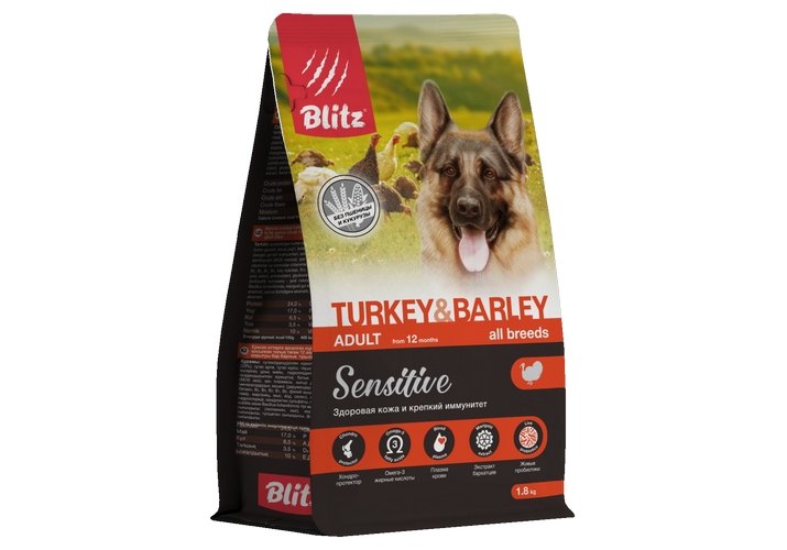 Blitz Sensitive Adult All Breeds Turkey & Barley Сухой корм Блиц для взрослых собак всех пород Индейка ячмень 1,8 кг