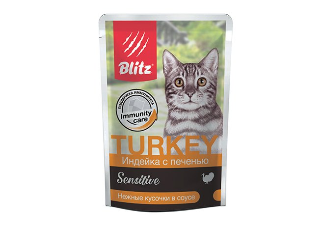 Blitz Sensitive Immunity Care Паучи Блиц для взрослых кошек Индейка с Печенью (цена за упаковку) 85г х 24шт