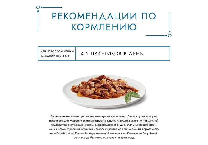 Для взрослой кошки среднего веса (4 кг) требуется 4-5 пакетика в день. Кормление желательно разделить минимум на два приема.
