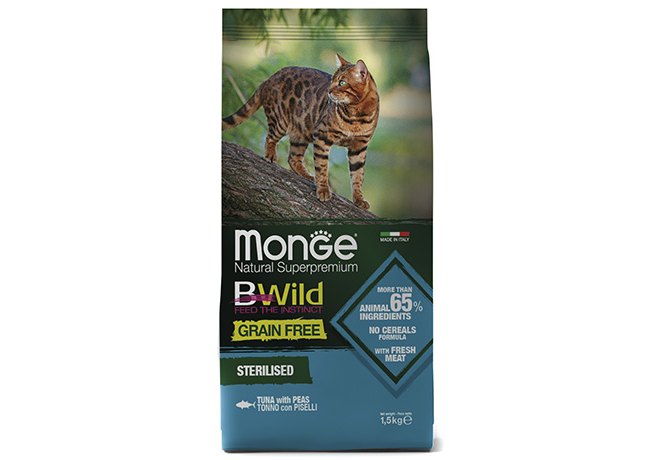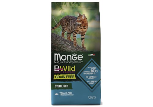 Monge Cat BWild Grain Free Sterilised Tuna Peas Сухой Беззерновой корм Монж Бивайлд для Стерилизованных кошек Тунец горох 1,5 кг