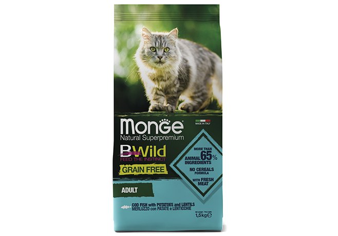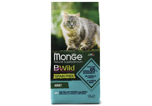 Monge Cat BWild Grain Free Adult Cod Fish Potatoes Lentils Сухой Беззерновой корм Монж Бивайлд для Взрослых кошек Треска картофель чечевица 1,5 кг