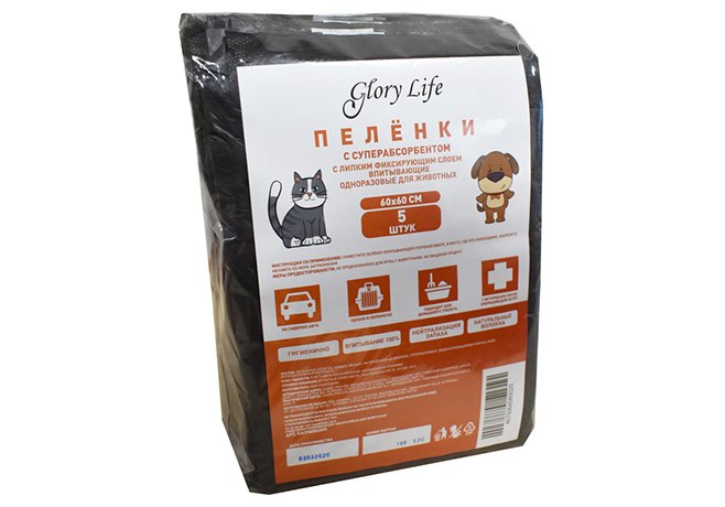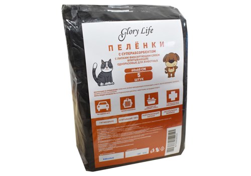 Glory Life Пеленки Глори Лайф для животных с Суперабсорбентом и Липким фиксирующим слоем Одноразовые Чёрные 60х60см 5шт