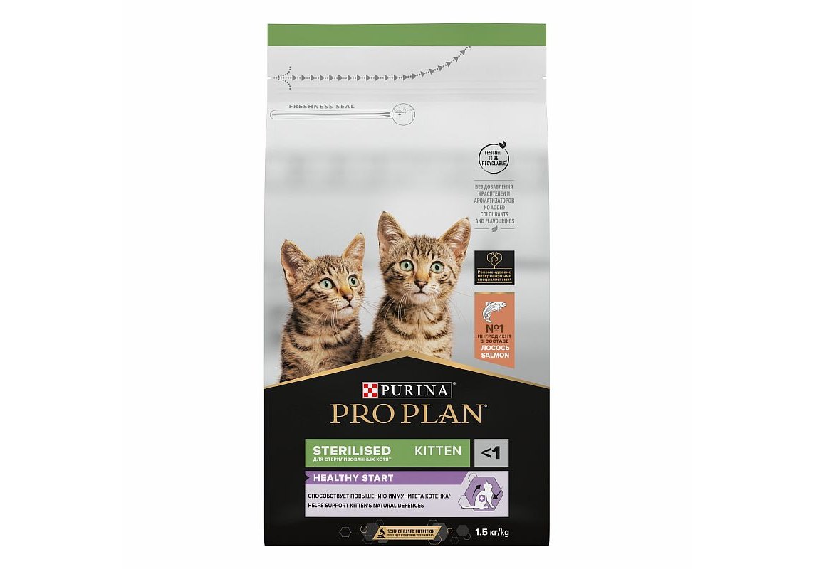Команда квалифицированных ветеринарных специалистов разработала рацион PRO PLAN® Sterilised Kitten HEALTHY START, способствующий повышению природного иммунитета котенка. Этот сухой корм учитывает индивидуальную потребность котят в белке высокого качества, витаминах и минералах, необходимых для нормального роста и развития.