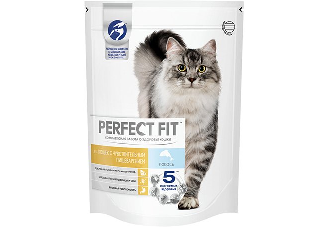 PERFECT FIT™ Sensitive с лососем – рацион, адаптированный специально для кошек с особенностями пищеварения. Он содержит пребиотики, способствующие поддержанию здоровой микрофлоры кишечника, и не содержит пшеницы и сои, которые могут вызвать дискомфорт в желудке кошки.