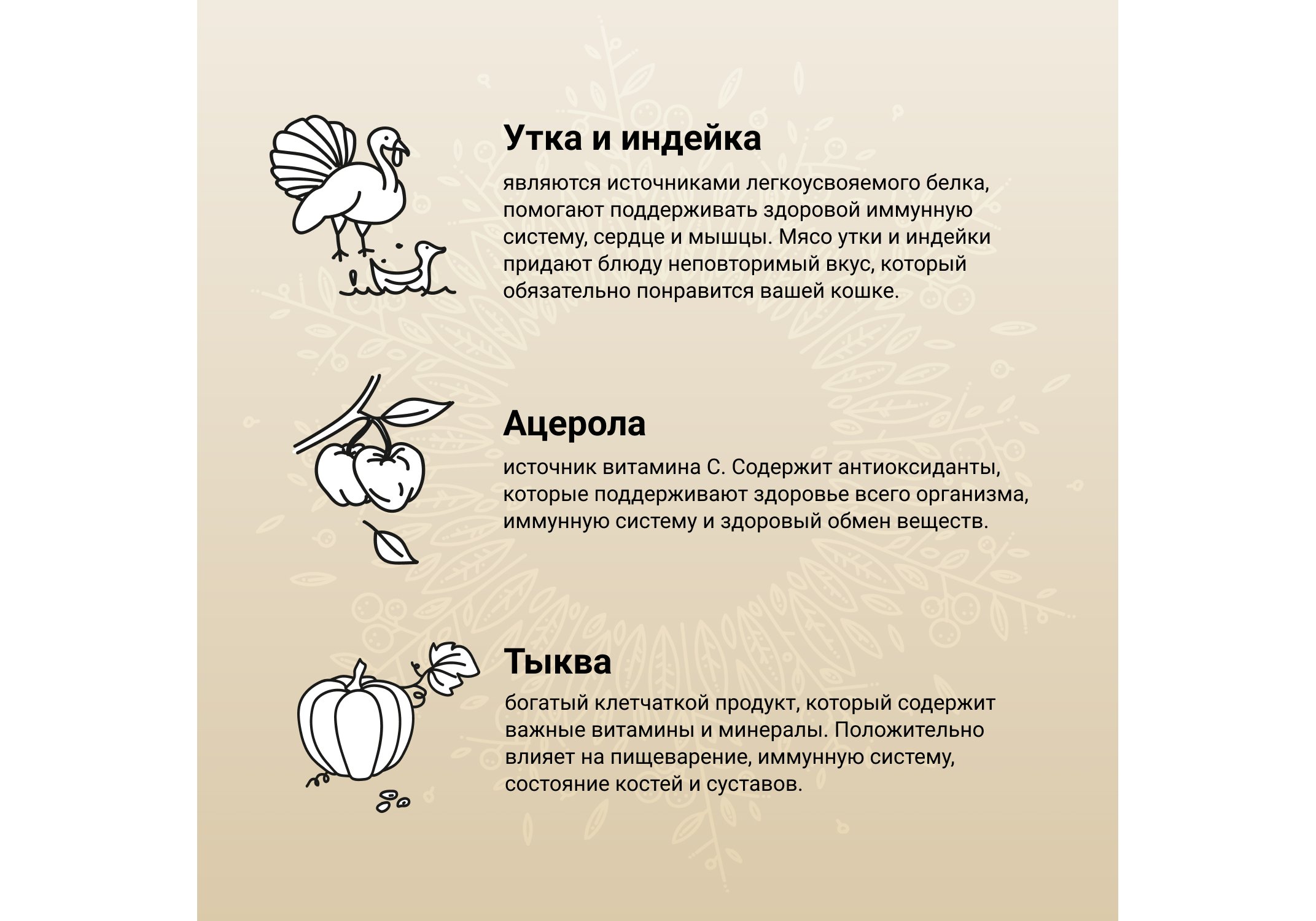 Основные источники белка в корме — свежее мясо утки и индейки. Комбинация этих белков легко переваривается, помогает поддерживать оптимальный вес питомца, стабилизирует обмен веществ. Утка и индейка — отличные источники незаменимых аминокислот, витаминов и минералов. Исключен распространенный аллерген — курица.