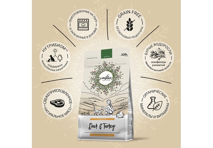 Craftia — корма класса ультрапремиум, созданные с заботой о питомцах и окружающей среде. Тщательно подобранные ингредиенты, уникальные рецептуры — в этих кормах есть все необходимое, чтобы питомцы и их владельцы ощутили гармонию жизни, здоровья и природы.
