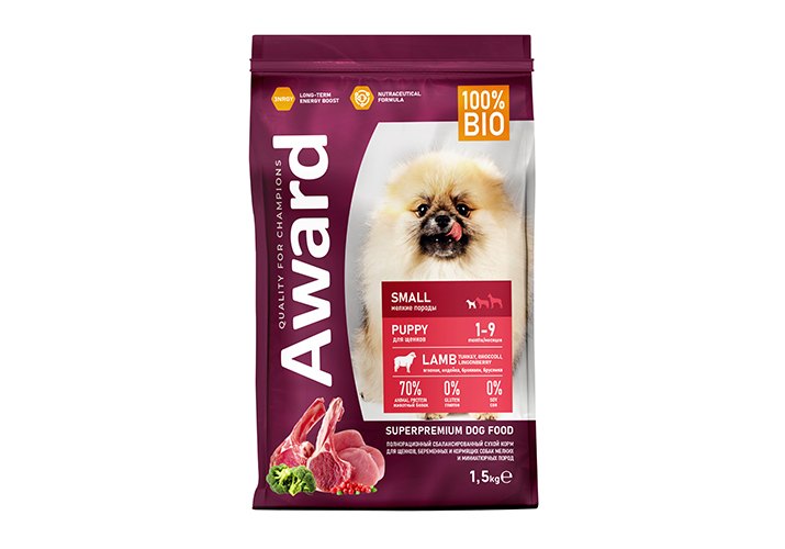 Award Puppy Small Сухой корм Авард для Щенков от 1 месяца, беременных и кормящих собак Мелких и миниатюрных пород Ягненок индейка брокколи брусника 1,5 кг