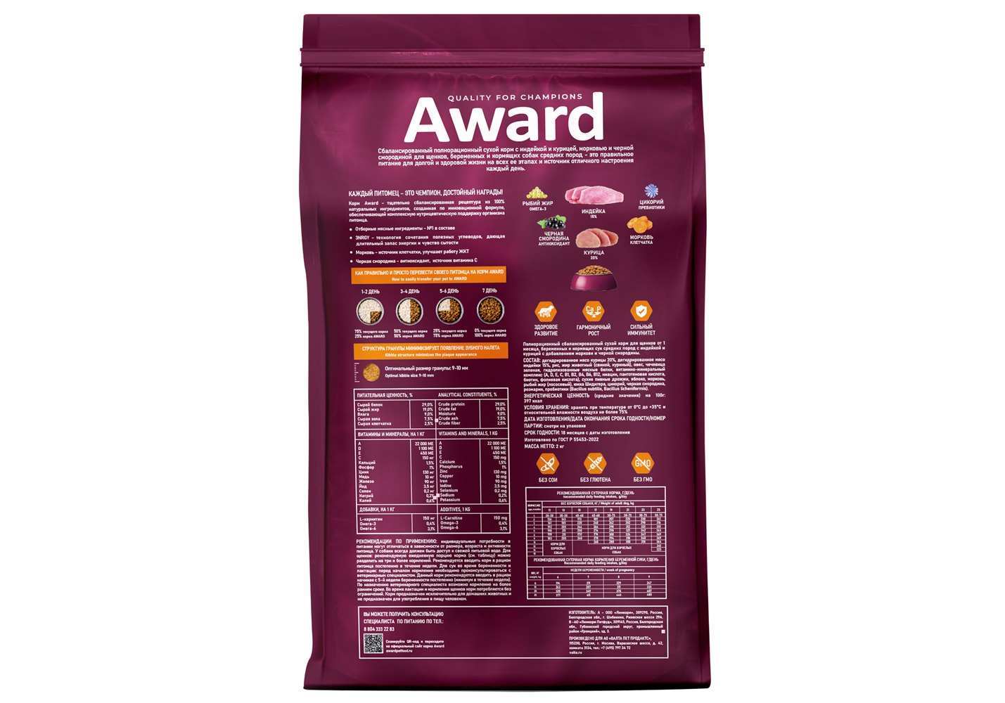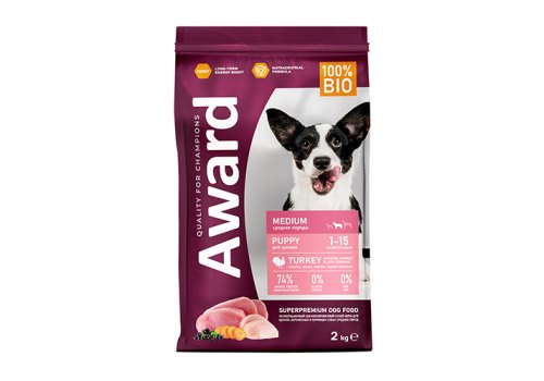 Сухой корм AWARD для щенков от 1 мес, беременных и кормящих сук средних пород с индейкой и курицей с добавлением моркови и черной смородины 2 кг