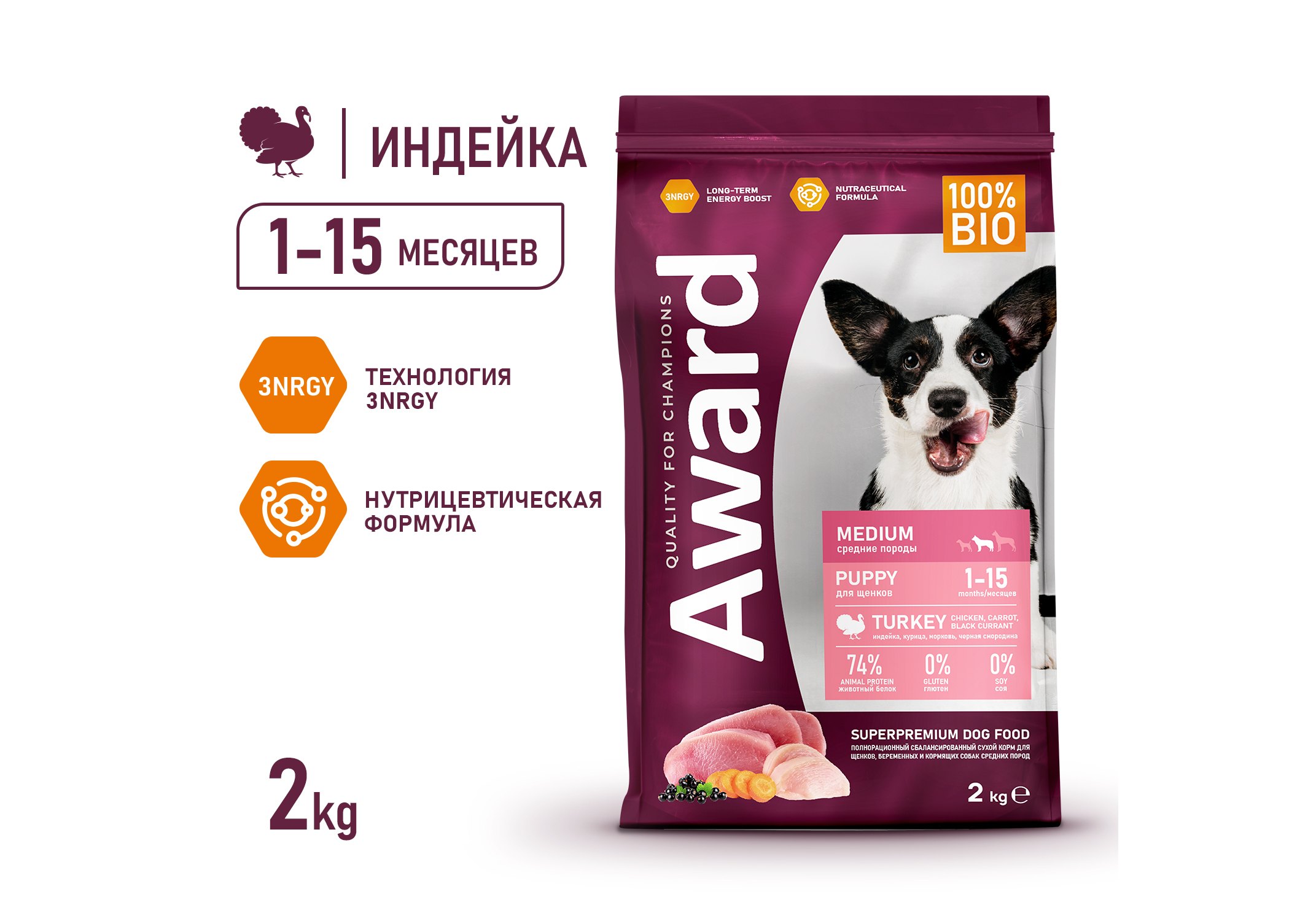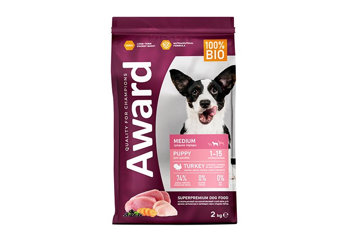 Award Puppy Medium Сухой корм Авард для Щенков от 1 месяца, беременных и кормящих собак Средних пород Индейка курица морковь черная смородина 2 кг