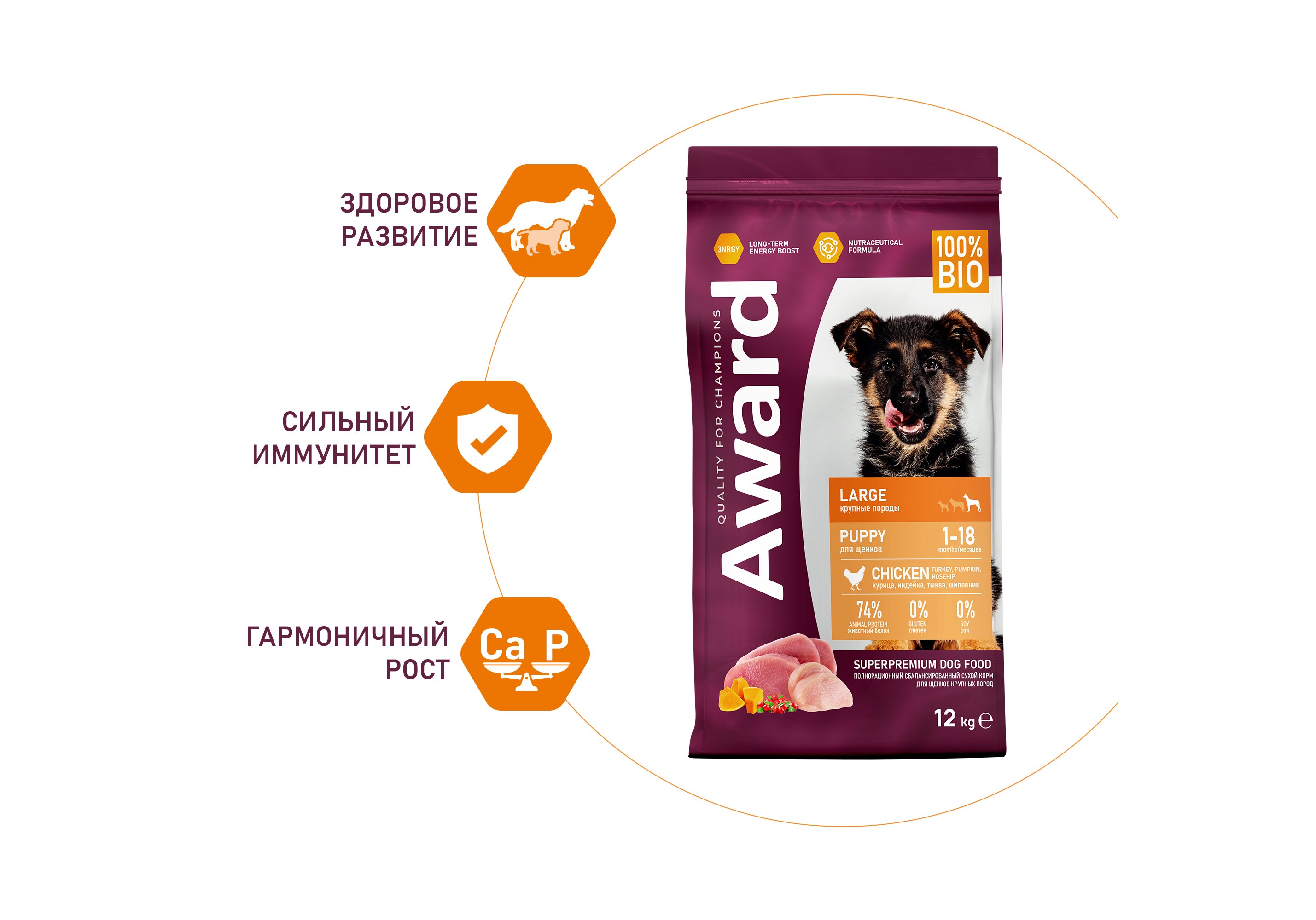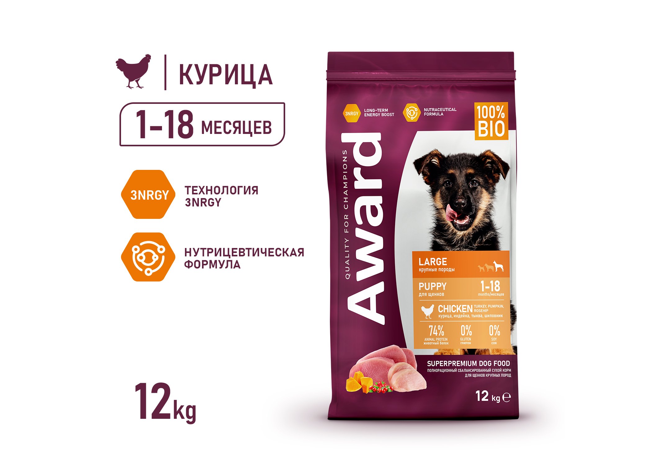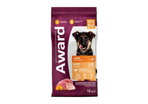 Сухой корм AWARD для щенков от 1 месяца крупных пород с курицей и индейкой с добавлением тыквы и шиповника 12 кг