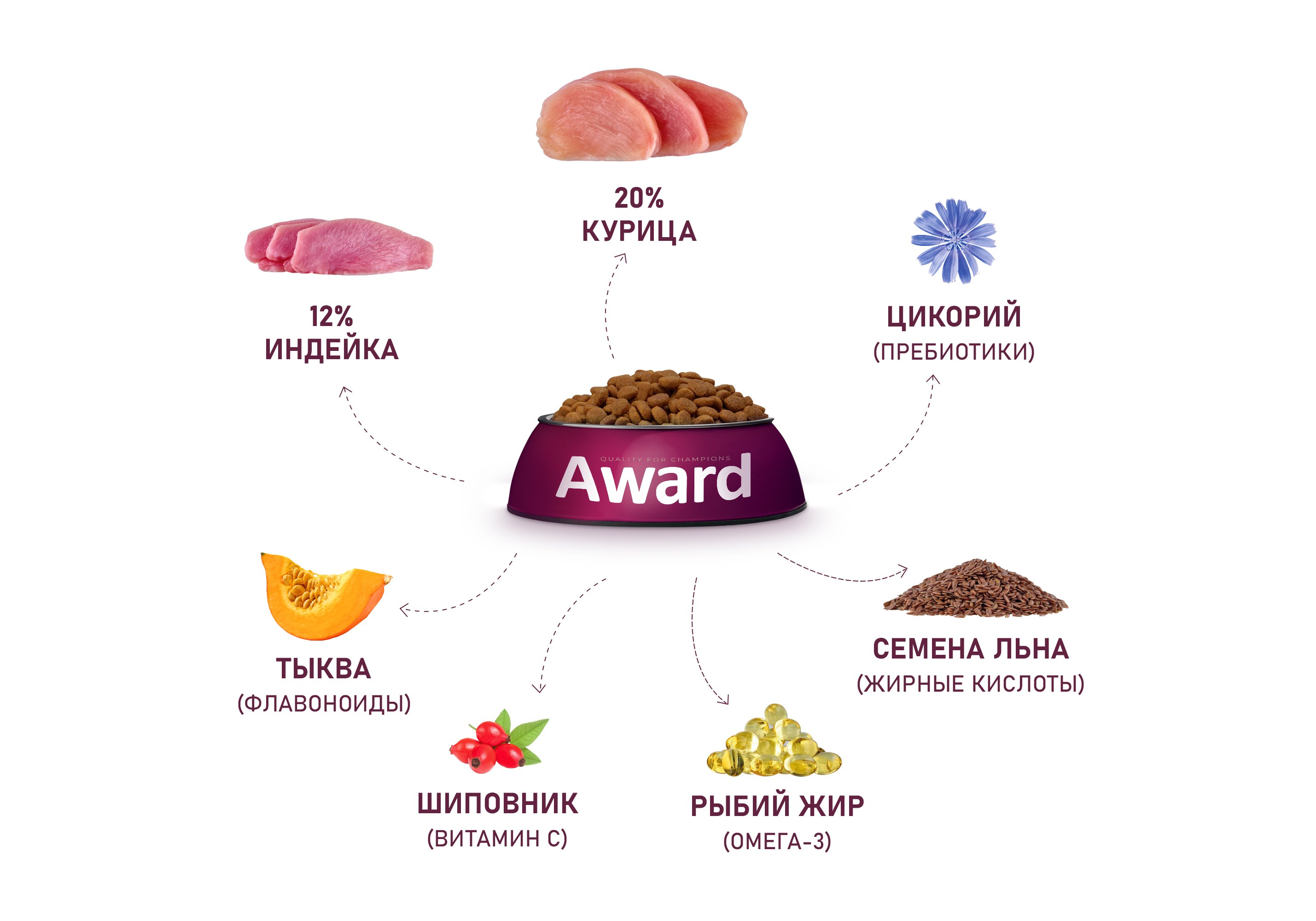 Корма AWARD созданы, чтобы просто и правильно заботиться о здоровье и долголетии своего питомца, взамен получая радость от времени, проведенного вместе. Мы считаем каждого питомца чемпионом и поводом для гордости!