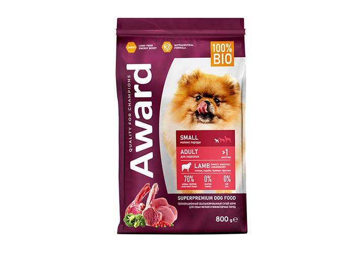 Сухой корм AWARD для взрослых собак мелких и миниатюрных пород с ягненком и индейкой с добавлением брокколи и брусники 800 г