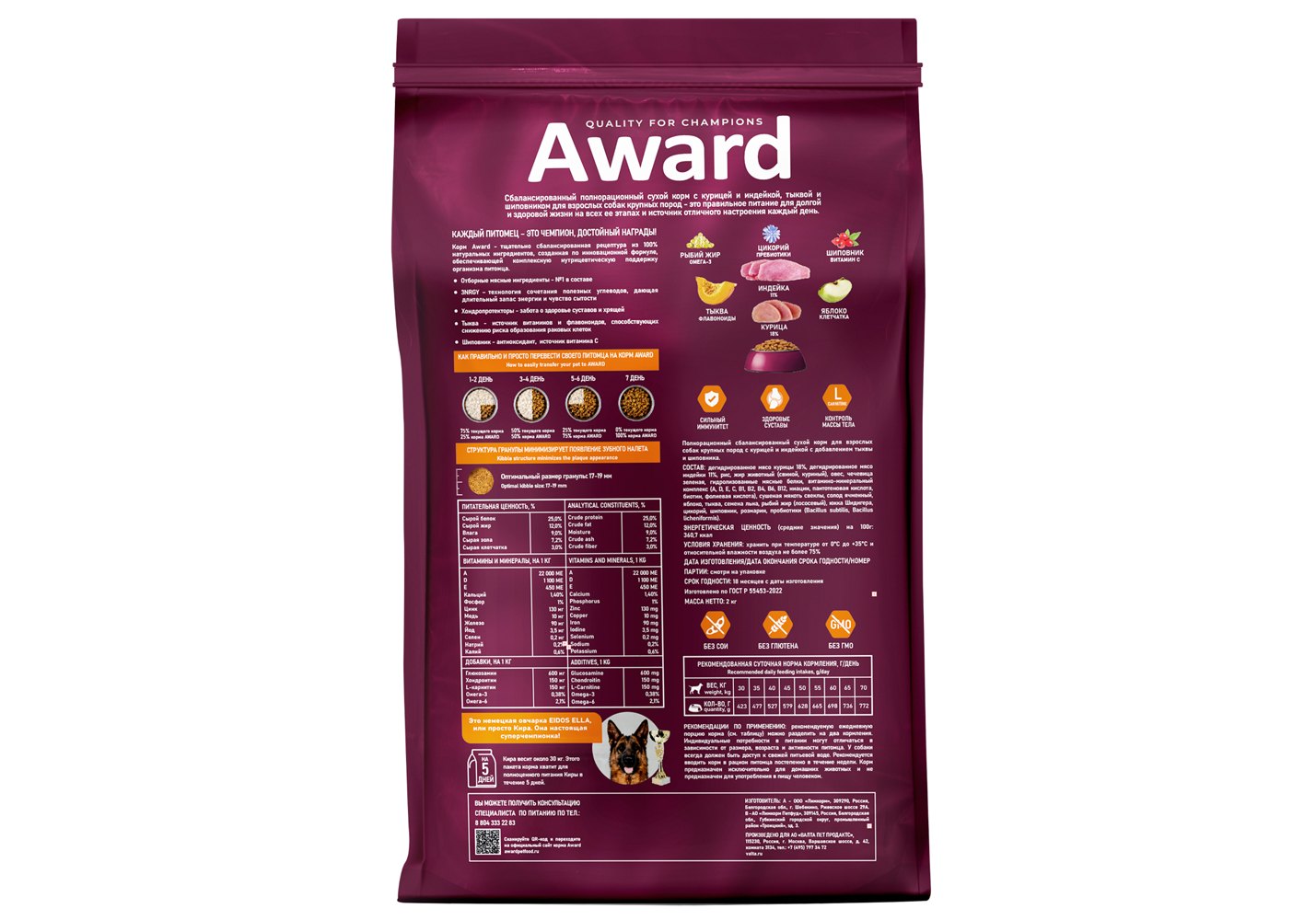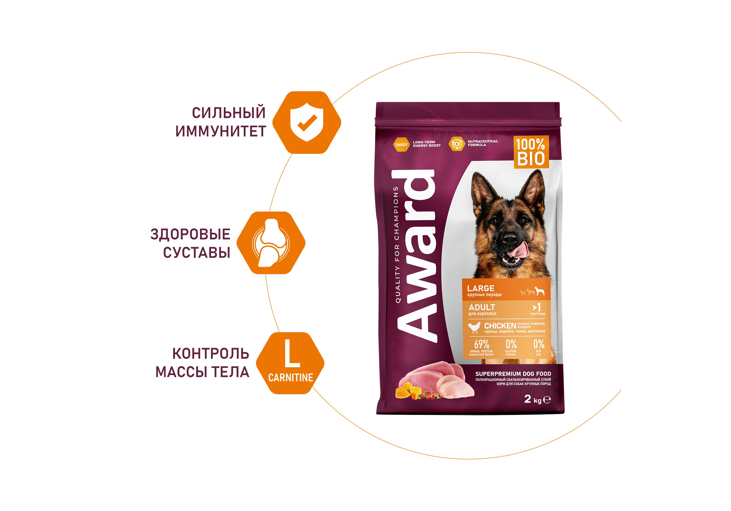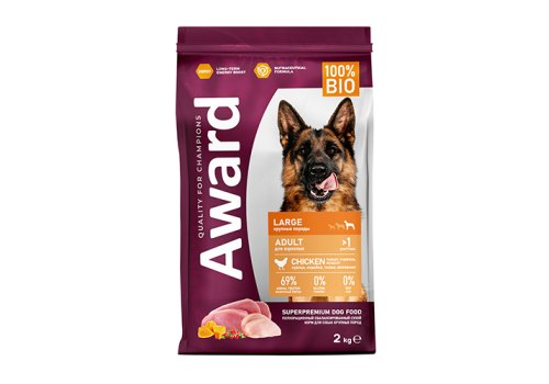 Сухой корм AWARD для взрослых собак крупных пород с курицей и индейкой с добавлением тыквы и шиповника 2 кг