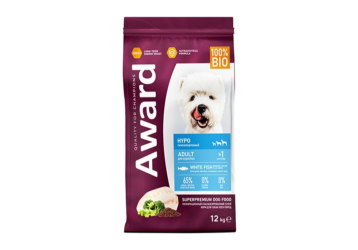 Сухой корм AWARD HYPO для взрослых собак всех пород с белой рыбой с добавлением брокколи, сельдерея и семян льна 2 кг.