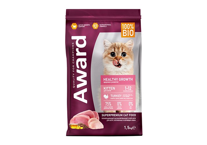 Сухой корм AWARD Healthy growth для котят от 1 месяца, беременных и кормящих кошек с индейкой и курицей с добавлением рыбьего жира и семян льна 1,5 кг