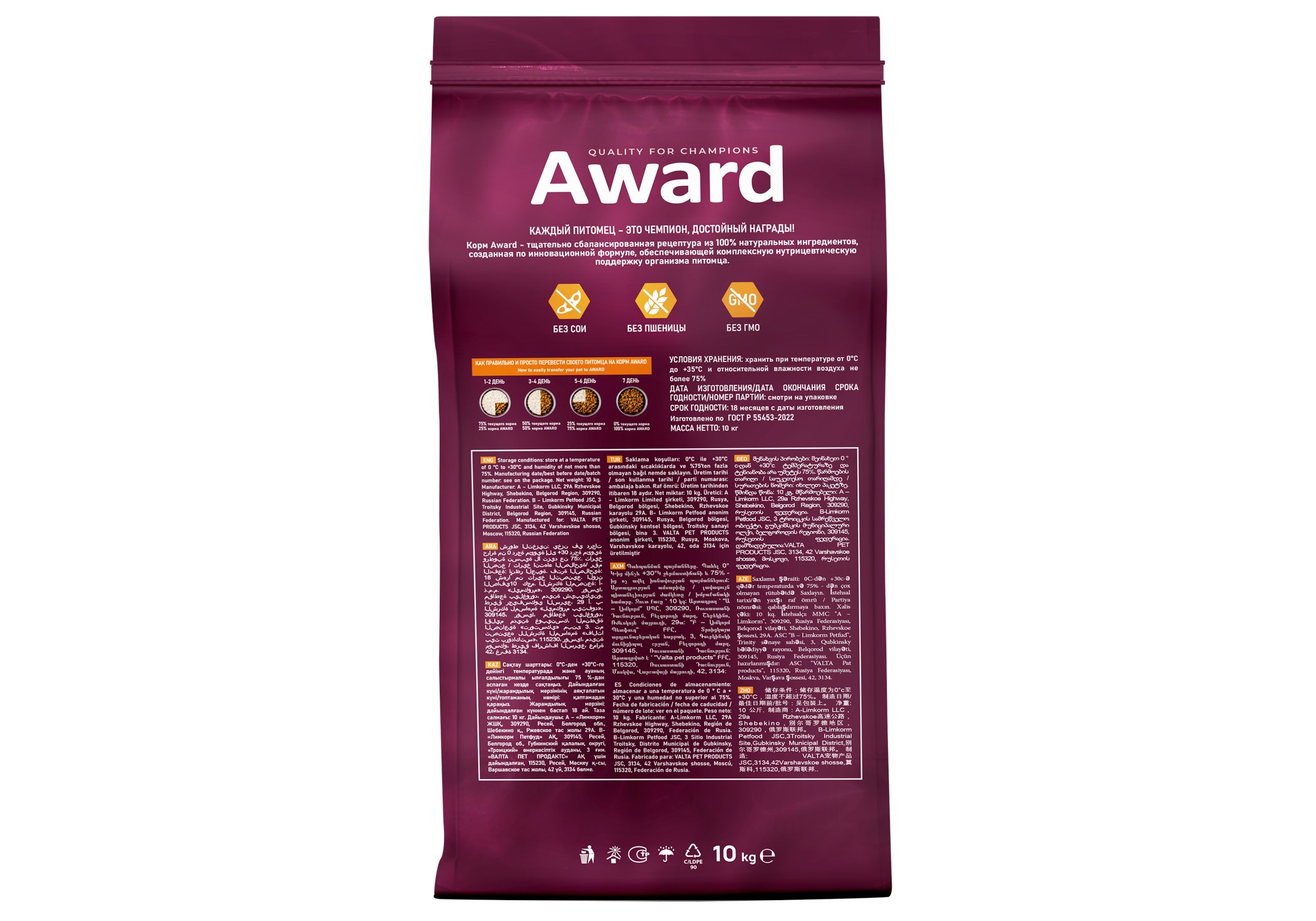 AWARD — это сухие и влажные корма для собак и кошек класса суперпремиум российского производства. Они разработаны профессиональными отечественными диетологами и содержат все необходимое для гармоничного развития питомцев.