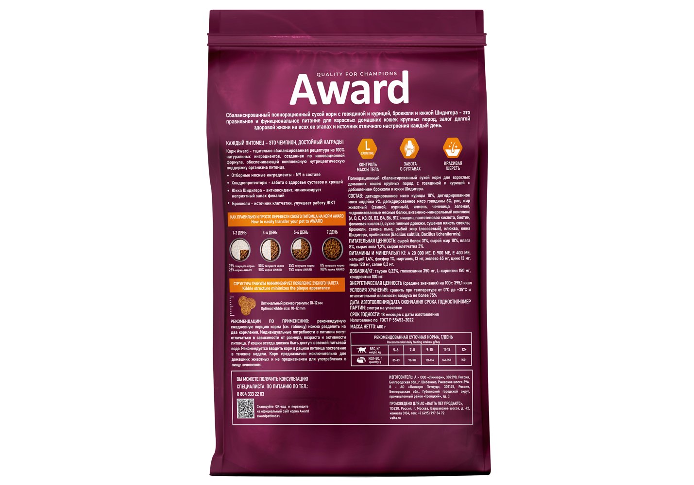 AWARD — это сухие и влажные корма для собак и кошек класса суперпремиум российского производства. Они разработаны профессиональными отечественными диетологами и содержат все необходимое для гармоничного развития питомцев.