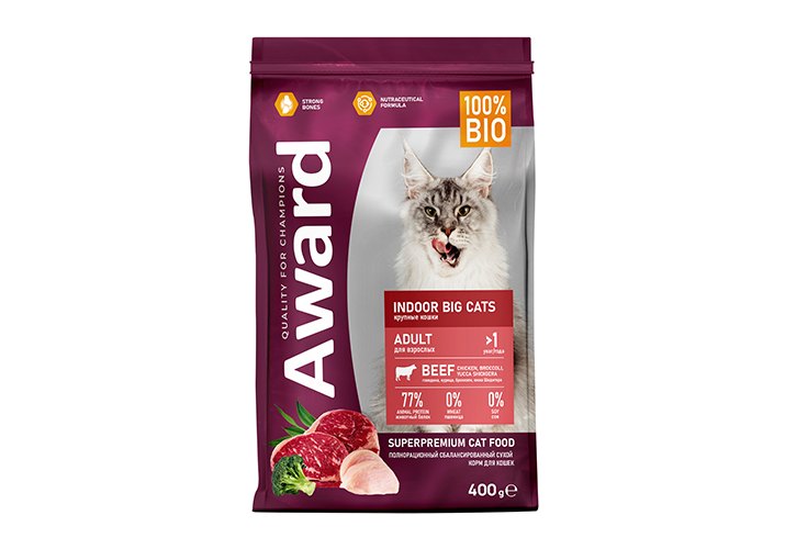 Award Indoor Big cats Сухой корм Авард для взрослых Домашних кошек Крупных пород Говядина курица брокколи юкка Шидигера 400 г