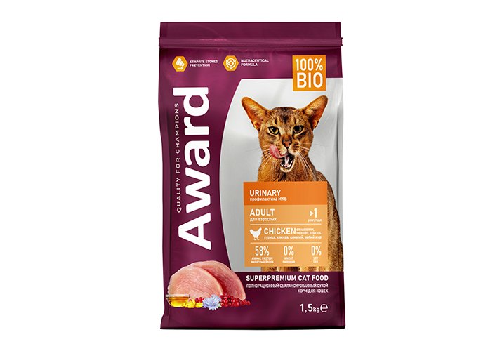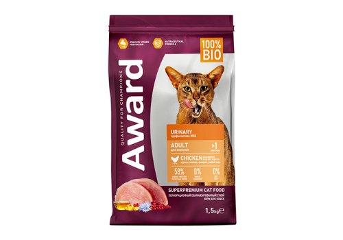 Сухой корм AWARD Urinary для взрослых кошек для профилактики мочекаменной болезни с курицей с добавлением клюквы, цикория и рыбьего жира 1,5 кг