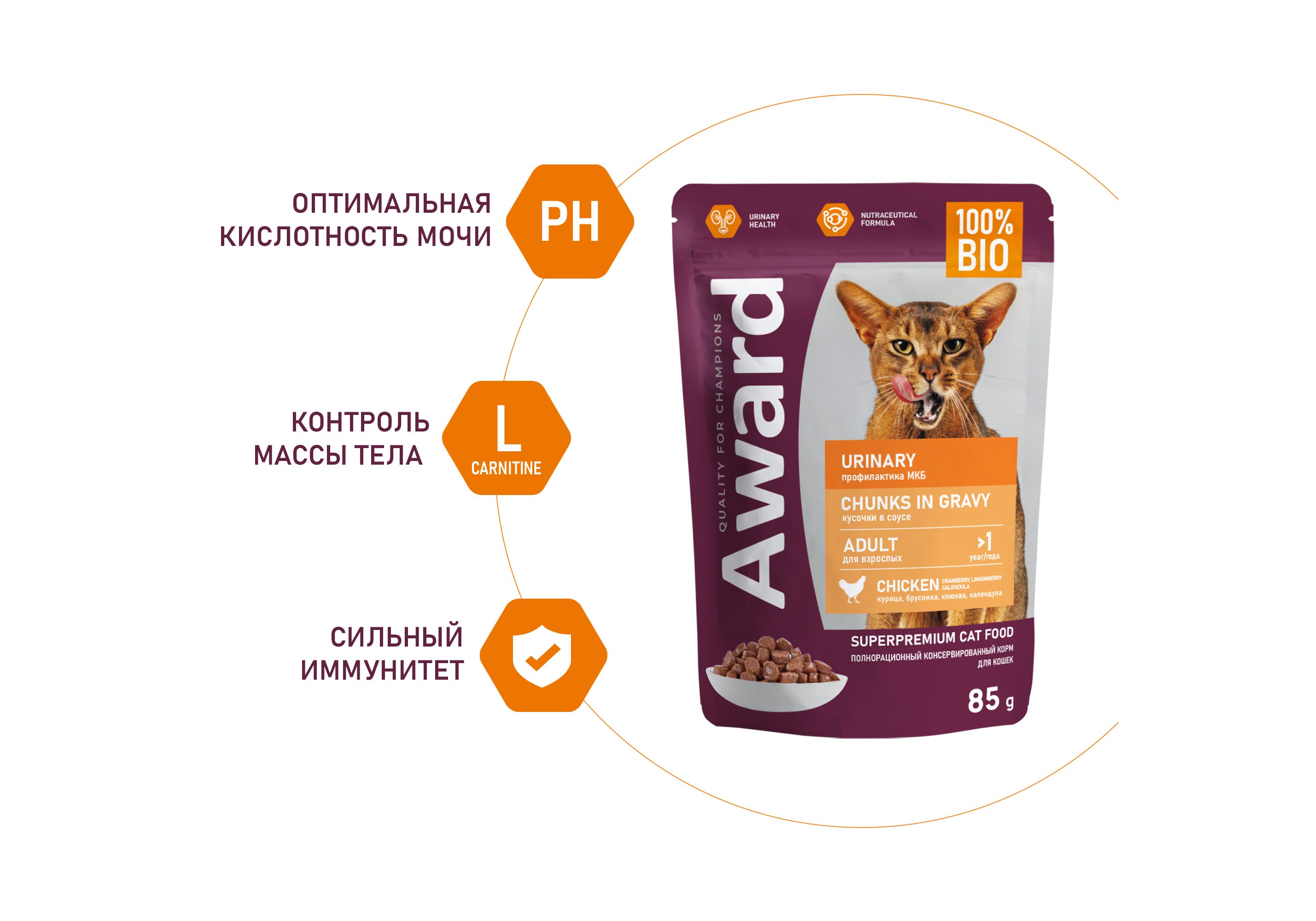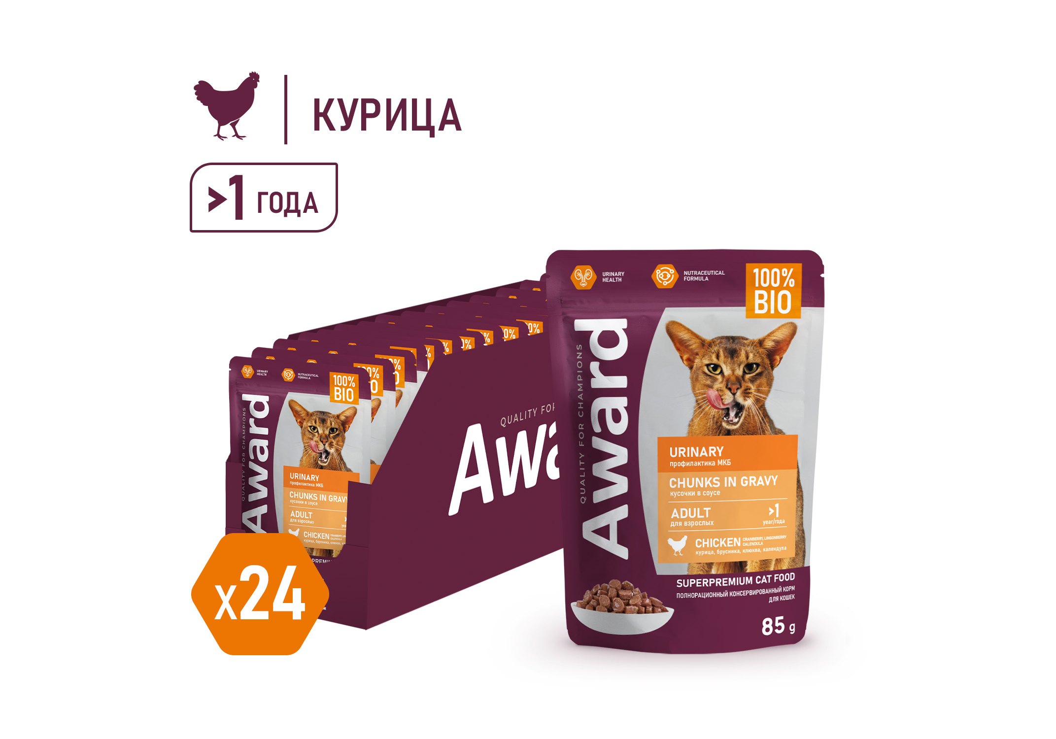 Award Urinary Влажный корм Паучи Авард для взрослых кошек для Профилактики МКБ Кусочки в соусе с Курицей (цена за упаковку) 85г х 24шт