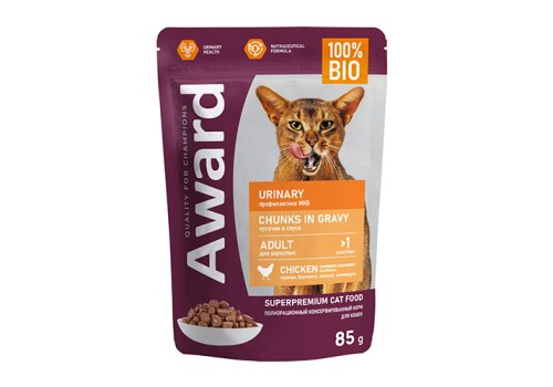 AWARD Полнорационный консервированный корм «Urinary» для профилактики мочекаменной болезни у взрослых кошек, кусочки в соусе с курицей 85 г