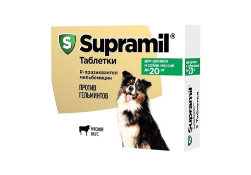 Supramil Таблетки Супрамил против гельминтов с мясным вкусом для Щенков и собак весом до 20 кг 1 х 2 таб