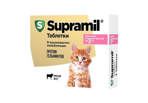 Supramil Таблетки Супрамил против гельминтов с мясным вкусом для Котят и кошек весом до 2 кг 1 х 2 таб