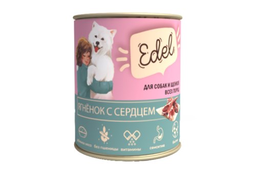 Edel Влажный корм Консервы Эдель для Щенков и собак всех пород Ягненок с сердцем (цена за упаковку) 850г х 6шт