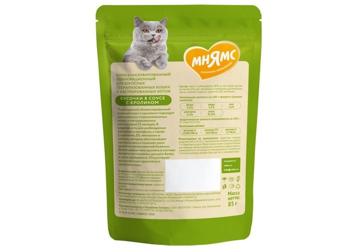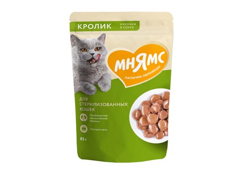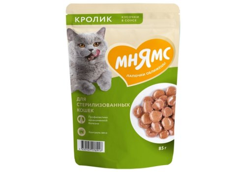 Мнямс Влажный корм Паучи для Стерилизованных кошек Кусочки в соусе с Кроликом (цена за упаковку) 85г х 24шт