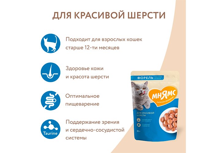 Мнямс Влажный корм Паучи для Красивой шерсти кошек Кусочки в соусе с Форелью (цена за упаковку) 85г х 24шт