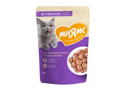 Мнямс Влажный корм Паучи для Комфортного пищеварения у кошек Кусочки в соусе с Ягненком (цена за упаковку) 85г х 24шт