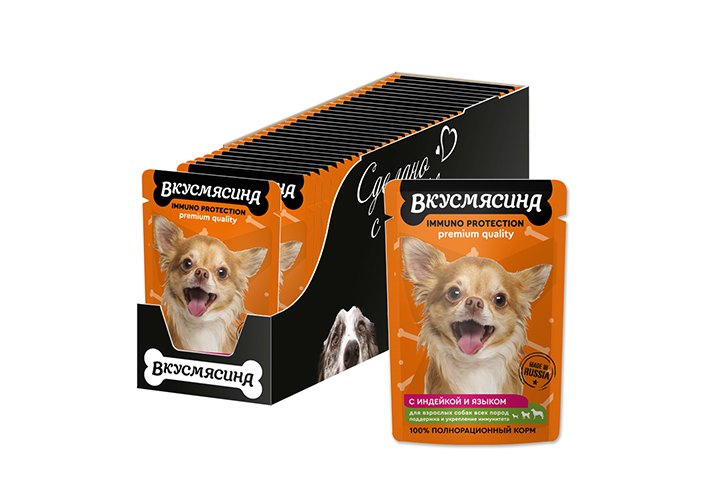 Вкусмясина Влажный корм Паучи для собак для Поддержания иммунитета Кусочки с Индейкой и языком в соусе (цена за упаковку) 85г х 30шт