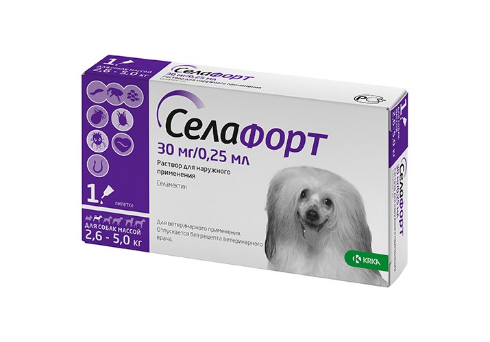 Krka Селафорт Капли на холку для собак весом от 2,6 до 5 кг от Внешних и внутренних паразитов 30мг 1 пипетка